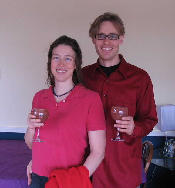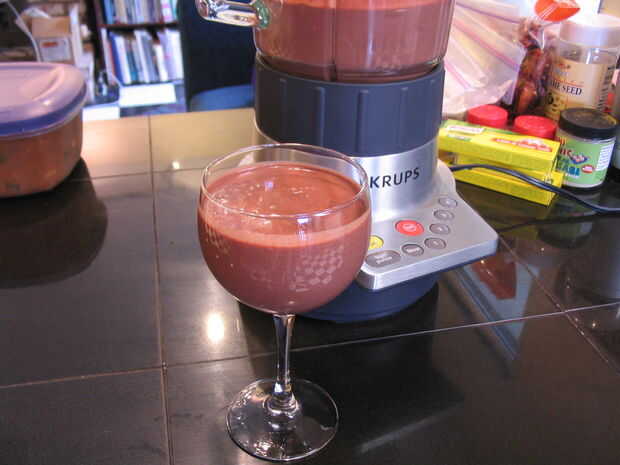 Empapar el té y disolver el chocolate en agua caliente durante 5 minutos. Deje que el té chocolate mezcla enfríe. Mezclar todos los ingredientes y mezcla hasta que quede suave.