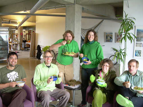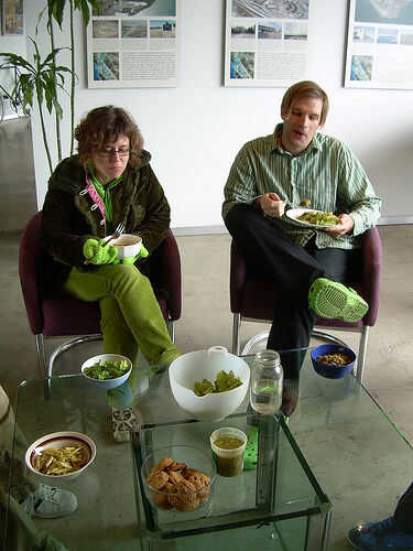 Benji hizo penne con pesto, una ensalada todo verde (lechuga, pepino, manzana verde, apio) y salsa verde (salsa de tomatillo) servido con algunos chips con sabor a guacamole algo siniestro cubierto en polvo verde guac. Las virutas de guacamole estaban tan cerca de hacer trampa con comida para colorear como conseguimos.