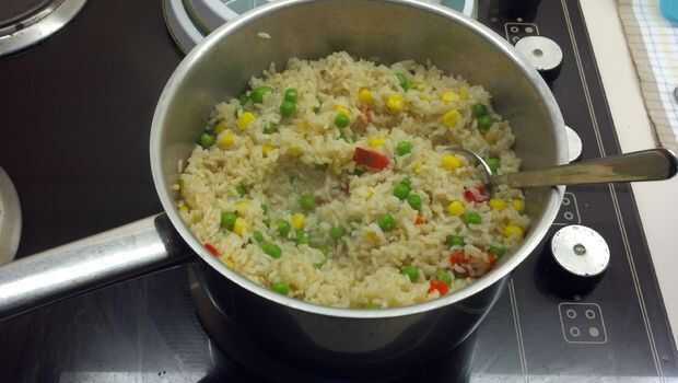 Para el almuerzo y la cena, decidí ir con un arroz frito vegetariano como que me permitió obtener en un montón de hidratos de carbono (carbohidratos = energía, carbohidratos = / = grasa) y productos tanto 'frescos' como me pude permitir. Hablando de frutas y verduras, son muy importantes en una dieta equilibrada. Por lo menos donde vivo, congelados vegetales son más baratos que los frescos, la diferencia de precio es suficiente para justificar el ahorro hecho, y por desgracia, perdió la nutrición. Verduras congeladas son sin embargo, mejor que no verduras. Arroz fue elegida porque era más barato, es más nutritivo que el arroz blanco y también que mis comidas mire un poco menos plano. :-)