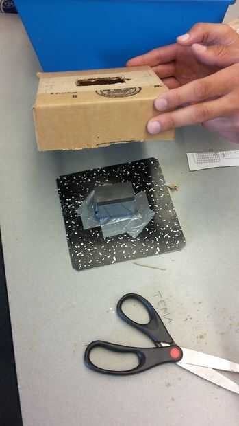 Hacer una pila de 5 imanes fuertes, rectangulares. Tomar una caja de cartón y cortar un rectángulo en el medio para adaptarse a los imanes en. Coloque los imanes en una pieza plana de cartón y luego colocar el cuadro encima de los imanes para hacer la base.
