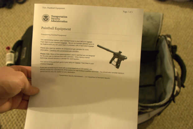 Armas de paintball (o paintball marcadores dependiendo de tu nivel de lo políticamente correcto) no se consideran armas de fuego por la TSA. Debido a esto usted puede embalarles suelta en el bolso pero yo recomendaría que usted los embalamos en un caso dentro de su bolsa de engranaje principal. Esto ayudará a protegerlo contra robo y daños. La TSA tiene una página web especial para volar con equipo de paintball y me gustaria imprimir una copia de él a tirar en mi caso. No puede garantizar que un agente de TSA abre su bolsa y entender cuáles son los contenidos. Usted puede encontrar el sitio web de TSA aquí: Equipo de Paintball de TSA