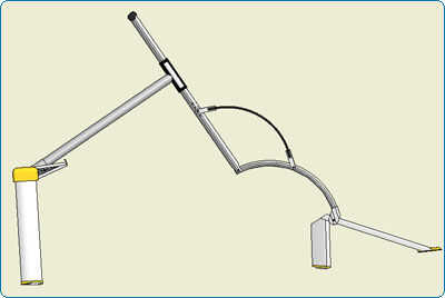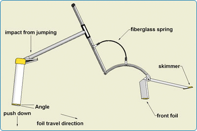 Entonces empezar a despedir. Estos dos diagramas de la Página Web de Inventist muestran qué pasa con el gizmo cuando rebota. En la parte de "abajo" de la carrera de la suspensión se comprime y se sumerge la lámina posterior. En el ' para arriba "parte de la carrera de la primavera se endereza hacia fuera, los swoops del ala para arriba en el agua y se deslizan hacia delante. No es automático, tienes que aprender la habilidad.