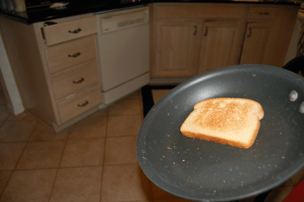 En la clase de alimentos, nos dijeron que podíamos aprender practicando con un pedazo de pan tostado. Es cómo voy a mostrarte. Nunca lo he probado, pero mi papá dijo que aprendió (en el Culinary Institute of America) con guisantes congelados.