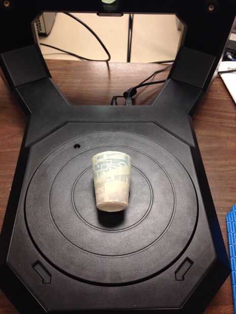 Asegúrese de calibrar su escáner si se ha movido o si no ha sido hecho en un rato. Para el ejemplo utilizaré una makerbot escáner y una impresora. Abra el software y configurar el objeto en el centro y deje escanear. Dependiendo de su objeto, que tendrás que buscar 2 o 3 veces para conseguir todas las características del objeto.