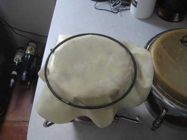 Con las varillas totalmente sueltas y la borde eliminado, coloque la piel suave y húmeda del casco del tambor y coloque el anillo metálico sobre el tambor.