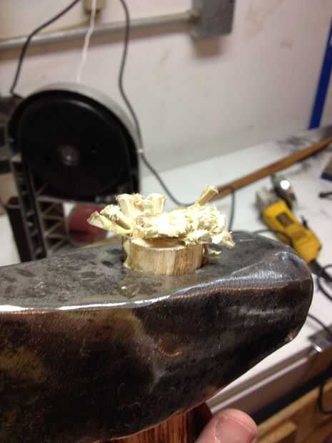 En coche la cuña. Puedes ver en la foto 5 que manejé la cuña en hasta que fue al ras con la parte superior del mango. Creo que la manija fue más corta, podría han impulsado la cuña más. He intentado solucionarlo por recortar la manija en ambos lados de la cuña por lo que podría conducir la cuña profunda (foto 6). El pegamento ya había establecido, o la cuña se tocó fondo en la ranura en el mango porque la cuña apenas partido a pedazos (foto 7).
