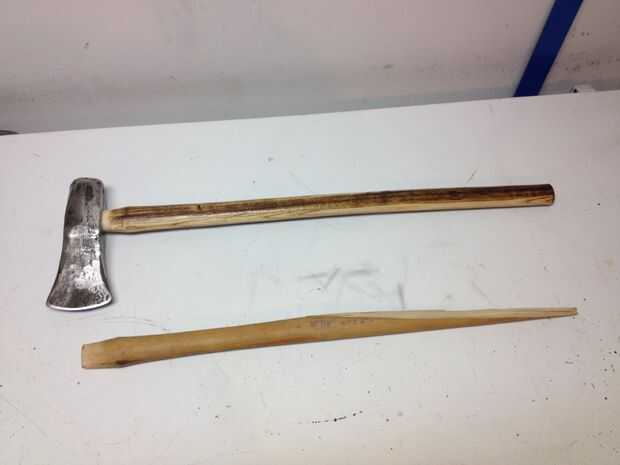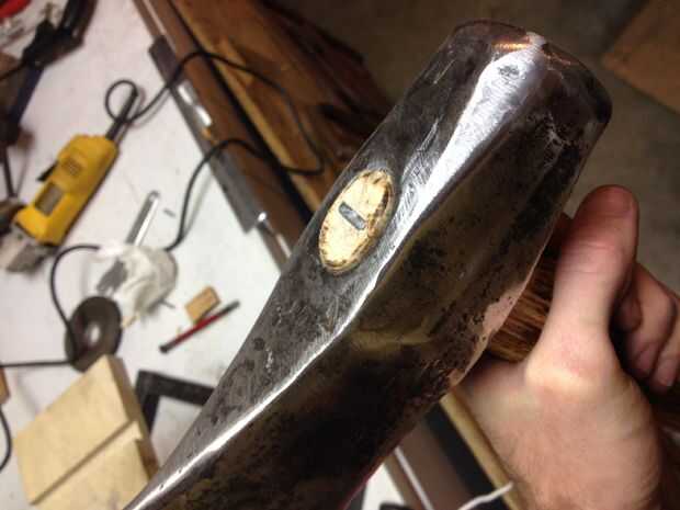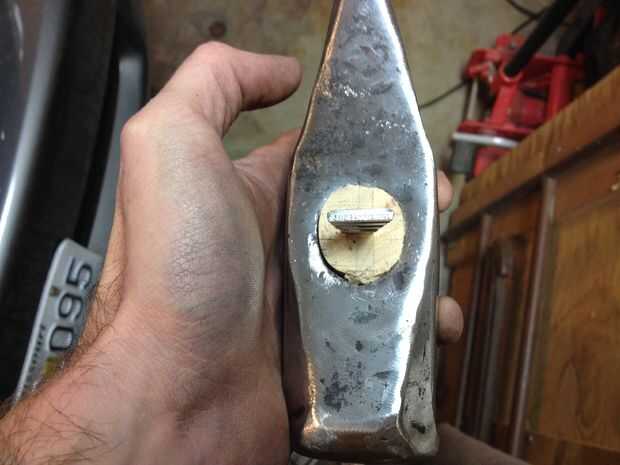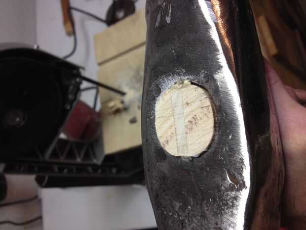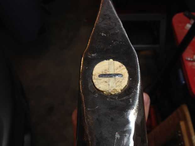 Si tienes una cuña de metal, tiene que instalar perpendicular a la cuña de madera. Esto sirve dos propósitos. Mantiene la cuña de madera de sacar, y ayuda al mango de la dirección opuesta como la cuña de madera para llenar los vacíos de la cuña. En este particular mango, puedo instalarlo directamente a través. En algunas herramientas, deberá instalar en un ángulo. He visto algunas herramientas que utilizan dos cuñas de metal para ayudar a difundir la manija para ajustar algunos oblongo o lágrima en forma de ojos de herramientas.
