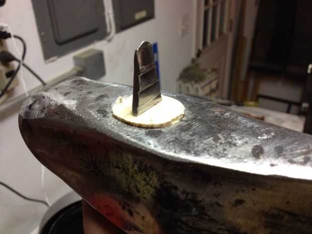Este paso es tan fácil como el centrado de la cuña y conduce en. Notar el espacio en el extremo trasero del ojo antes y después la cuña del metal es instalado (foto 4 y 5). Una vez en la cuña, redondear el filo donde cortar el mango con un papel de lija y vaya comienzo choppin'.