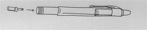 Lo tubo blanco de la gota (esta parte probablemente tiene un nombre científico, pero refiriéndose probablemente por no ayudar a) en el tubo de la pluma grande. Asegúrese de que su pequeño lado es hacia el lado de clicker.