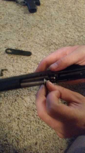 A continuación, instale el componente de apoyo resorte deslizando la punta en el marco de la diapositiva de la parte posterior en dirección a la boca, y el extremo del soporte en el tubo ya insertado.