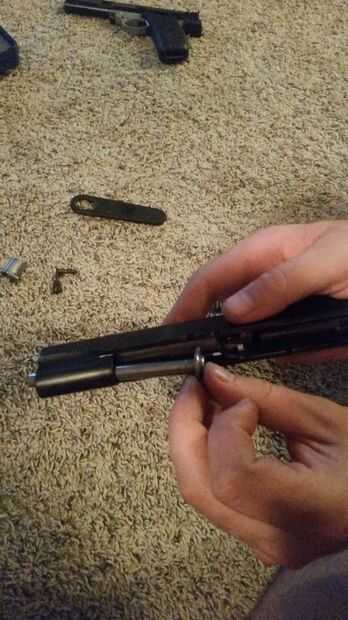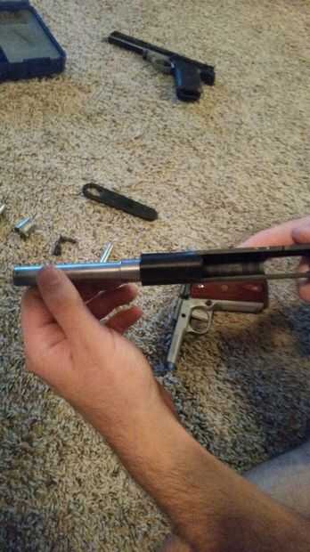 Empezar por insertar el barril en el marco de la diapositiva. Esto se hace sacando primero el cañón y