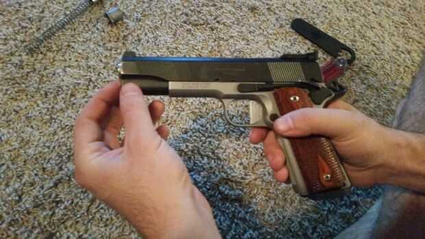 con la diapositiva en la posición de amartillado tomar la cerradura de cilindro e insertar a la diapositiva. Dejar en la posición desbloqueada torcido.