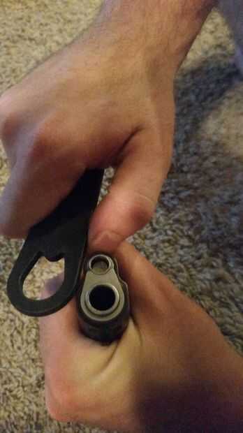 Con la herramienta, o la mano si no tienes una herramienta, presione el retén del resorte más hacia abajo y gire el retén del cañón el resto del camino en la posición de bloqueo.