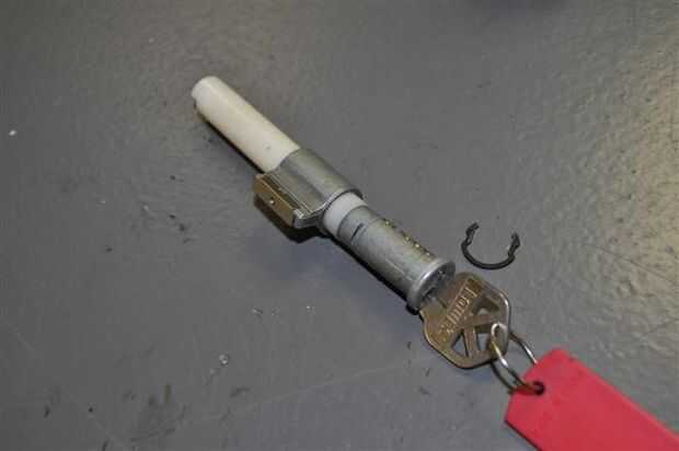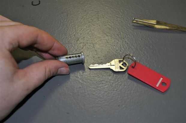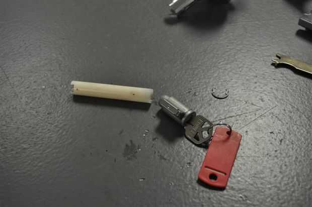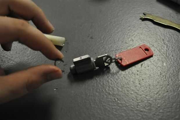 Luego, con la clave aún en y añadir presión, puede activarlo hasta que usted sienta el clic de algunos de los primeros alfileres son empujados hacia atrás en su lugar. Cuando eso se hace, puede añadir el clip de la clavija en la parte posterior para sujetar todo (foto 6), asegúrese de que la llave gira libremente el cilindro. Esto significa que ha logrado volver a la fijación.