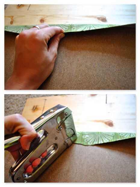 Una vez que se asegura la tela, utiliza la pistola de grapas (como se muestra en el video) y unas grapas a lo largo de la primera cara. No olvide añadir presión para que estas grapas fijar completamente y no rebotan para arriba.
