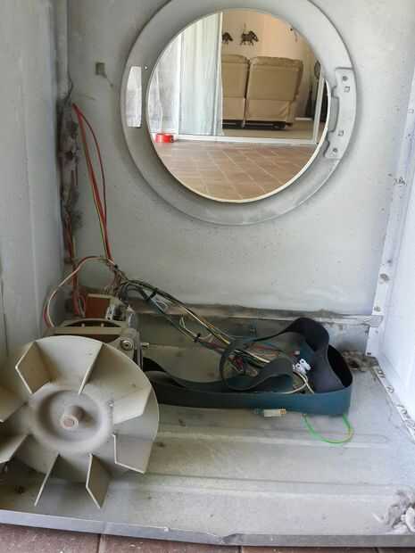Foto 1 muestra el motor en la esquina izquierda y los cables y correa a la parte frontal de la secadora.