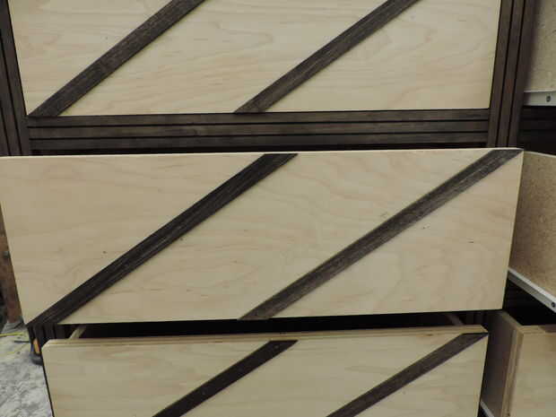 Medir desde el lado del frente del cajón al centro. Y marque el centro. Usted notará que en la foto, compensan las tiras del centro, de carácter más. Sostenga la tira en el frente del cajón, de la esquina inferior izquierda, a la marca superior. Compensar si te gusta el look, o sostener en el centro, marca la franja ejecutando un lápiz desde debajo de la tira. A continuación dirígete a la tronzadora y cortarlas.