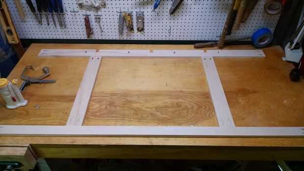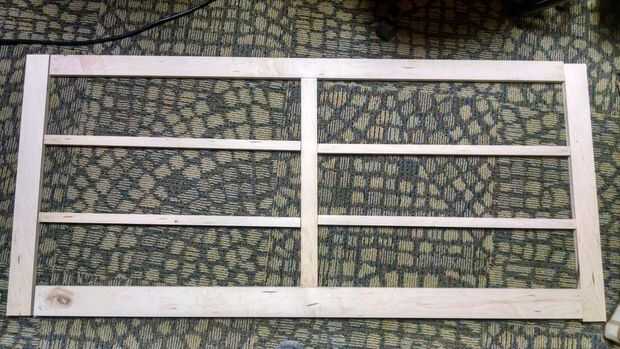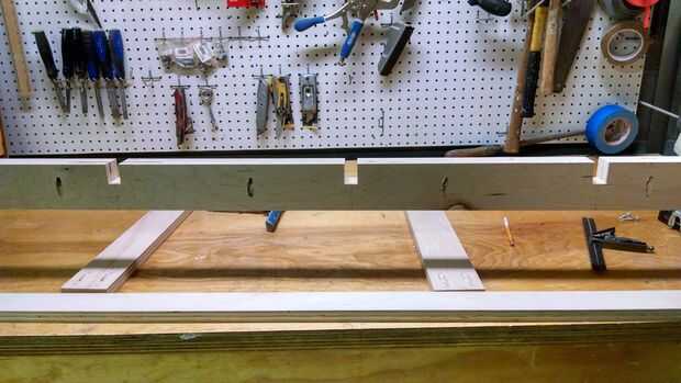 Para referencia, las piezas entre los cajones vertical son 1" de ancho, y entre las dos columnas es 1-3/4". Dejamos un borde de 2-1/2" en la parte superior y 3" en la parte inferior.