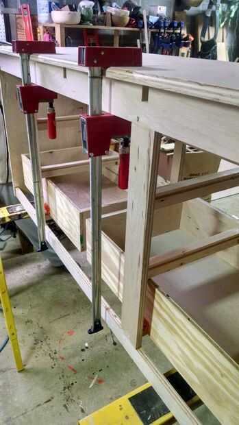 Para comenzar a instalar las tapas de dresser, primero nos dirigen nuestras tapas con la misma broca que utiliza para los cajones. A continuación quitar todos los cajones de la cómoda y fijar la tapa sobre el marco. Para nuestro diseño, la parte superior sobresale el marco de 1.5" en el frente y lados y ¾" en la parte posterior. Marcamos la parte superior al que tenía en lugar retirado y poner pegamento en las articulaciones. Luego sujeta la parte superior hacia abajo y atornillar en su lugar usando los orificios existentes de bolsillo que hemos hecho usando el plantilla kreg jig anterior.