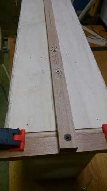 Para taladrar los agujeros de una manera centrada y repetible, hice un pequeño jig para hacer el trabajo. Como se puede ver en la foto, todo lo que tenía que hacer en cada cajón Alinee las piezas laterales a los lados del cajón y sujete en su lugar, y que podía perforar los agujeros en el mismo lugar en cada cajón. También nos habían avellanado la parte posterior de la cara del cajón para que los pernos se sentarían al ras.