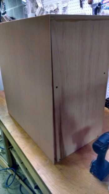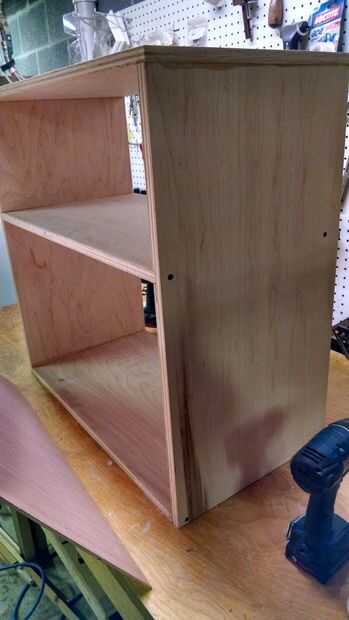 Había montado el estante seco (sin pegamento) bocabajo sobre la mesa de trabajo, luego pegado y atornillado a la parte superior hacia los lados (recordar el agujero piloto avellanado para evitar rajaduras). Luego hicimos lo mismo para el estante inferior. Encontramos que nuestro estante del medio era tan ajustada en la ranura que acaba de poner en algunos tornillos en lugar de forzarlo a usar pegamento.