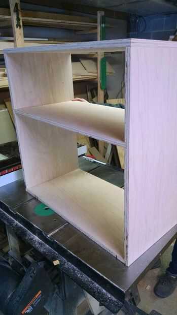 Elegimos nuestra altura útil basado en algunas latas grandes que íbamos a utilizar para el almacenamiento en el estante inferior, pero se podría hacer la plataforma en cualquier nivel. Nos encontramos con la hoja de ranurar a ser muy útil, porque apenas cortamos ¾" surcos anchos ¼" profundo en la parte inferior y a la altura de la plataforma. Hace muy fácil el montaje.