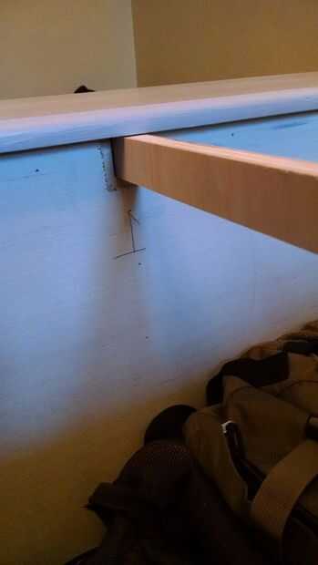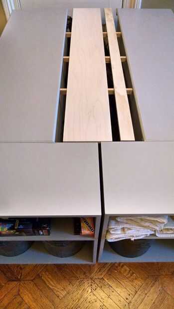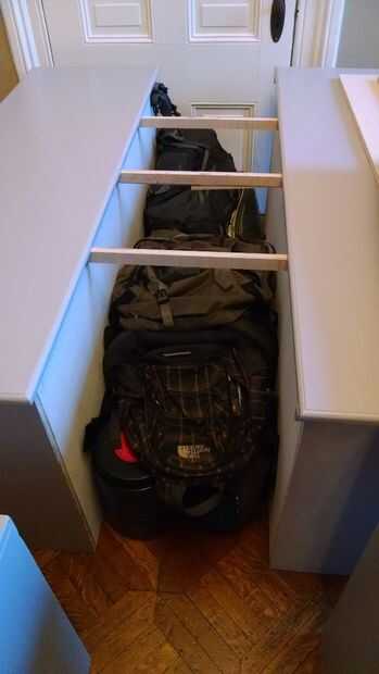 Estábamos muy emocionados cuando juntamos todas las piezas y todo funcionó como lo habíamos planeado. La noche antes nos mudamos que cortamos el 1-1/4" apoyo travesaños y unos listones para sujetar el colchón, y sólo tuvo 3 minutos para montar todo y el colchón en la parte superior. Estamos muy contentos con la cantidad de almacenamiento, que esto permite que en nuestro apartamento de armario menos. Como se puede ver, todo nuestro equipo de camping se ajusta entre los aparadores con sobra!