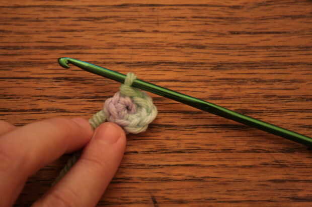 Con gancho de F, ch 2, 6 sc en 2 ch gancho, Únete.