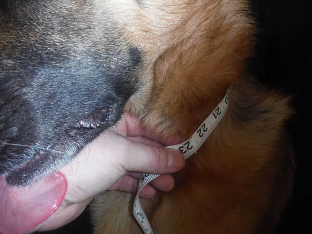 Conseguir su perro a sentarse aún para un tamaño de cuello puede ser una tarea y una mitad, fallando sin embargo, puede utilizar uno ya existente como modelo. Te recomiendo que lo es para que el collar a sentarse alrededor de la base del cuello, dejando espacio para la mano caber cómodamente dentro de ella. A mi perro, una raza grande, Pastor Alemán, fue 24" extremo a extremo del anillo del anillo.