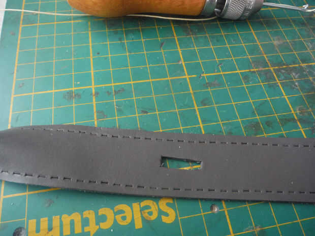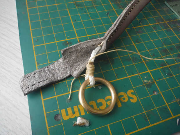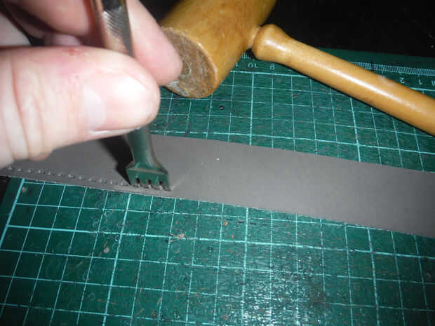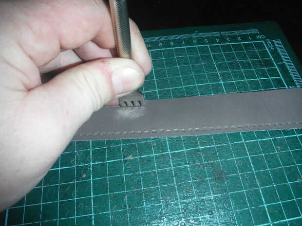 En primer lugar, usted necesitará de la forma cónica los extremos alrededor de los anillos. Retire una tira de 1/4 "x 1 1/4" de cada esquina como en la imagen #1. A continuación perfore una fila de orificios costuras a lo largo de cada borde de la tira de cuero. Asegúrese de perforar cuatro más a cada lado de la pestaña creada para asegurar el anillo.