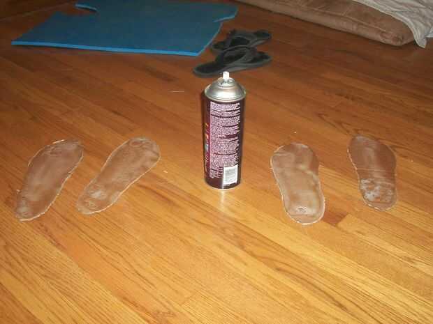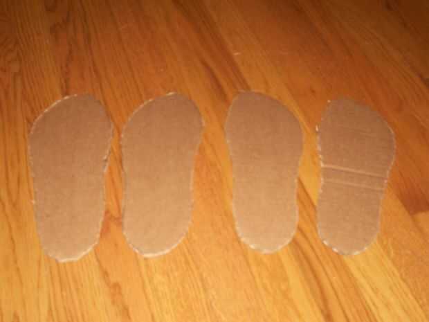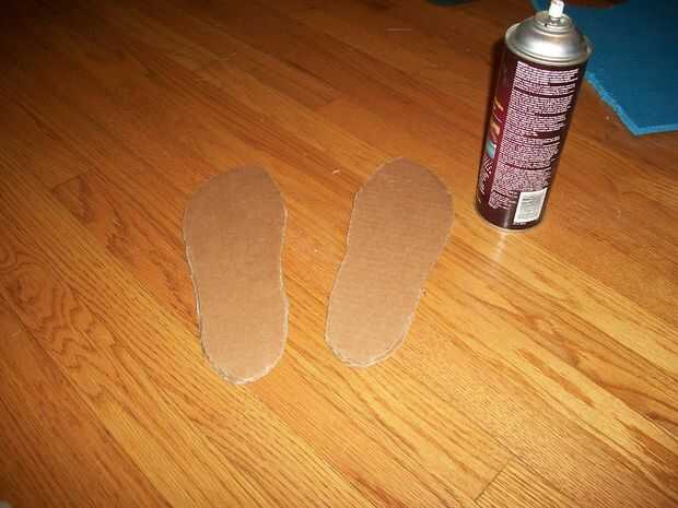Empezar por cortar 4 sandalia en forma de piezas de cartón. Utilizar adhesivo en aerosol para juntar dos recortes de cartón. Luego volver a hacerlo. Ta da! Ahora tienes tu base.