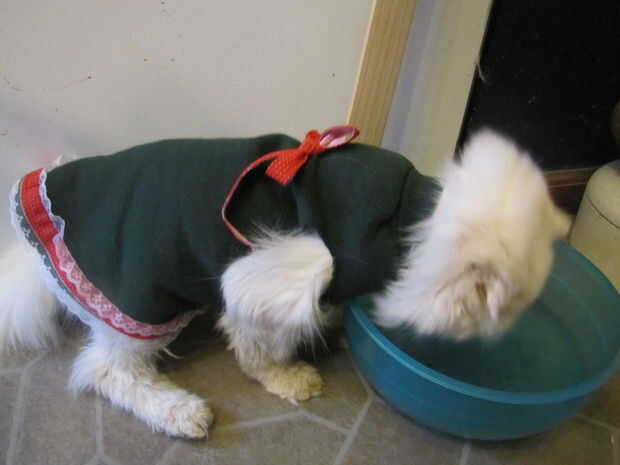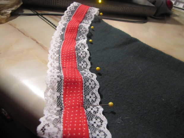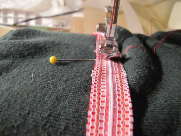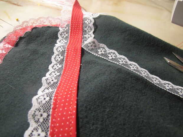 Para mi niña y para la temporada de Navidad, quería añadir alguna cinta roja con encaje a su nuevo vestido de suéter. Simplemente cubrió el cordón alrededor del borde inferior de la chompa y luego en con una simple puntada recta y coincidencia de hilo cosido. Ya que esta parte del suéter no se estira no tengo que usar una puntada elástica. Quería añadir un arco que empareja pero el encaje era un poco mucho. He cortado el cordón de la cinta del centro, había cosido entre las patas delanteras (donde están los omóplatos) y después atado en un arco.