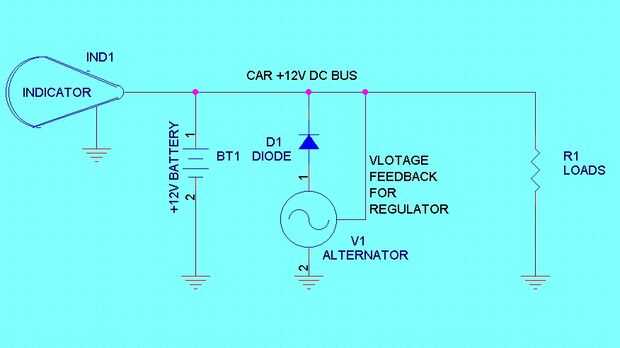 La batería de 12V con la ve - conectado al cuerpo es la fuente de energía primaria que es aumentada por el alternador de la CA cuando el motor está en marcha. La salida del alternador se rectifica y alimenta el bus, su salida es reglamentada basado en una conexión de retroalimentación. Diferentes cargas se cambian en el autobús cuando lámparas y otros sistemas eléctricos son operados.