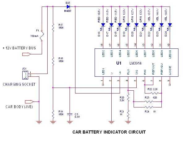 He utilizado el chip de controlador de pantalla LM3914 bar/punto, unas resistencias y unos LEDs, para implementar un simple voltímetro de escala ampliada. Elegir las resistencias con el fin de crear una gama de voltaje de entrada de 10 v a 15V compatible con el circuito abierto y el voltaje de carga para una batería de ácido plomo de 12V.