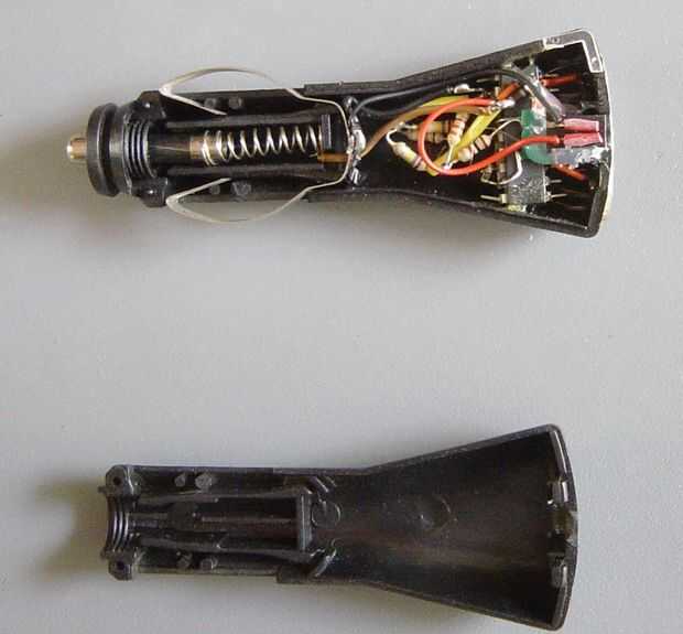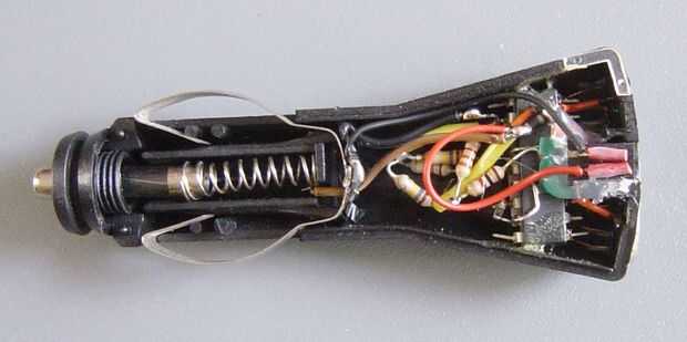 Alambré el circuito en una mitad de la caja del cargador del móvil. Tuve que adoptar el crudo pero efectivo método de 'sky-cableado' donde todas las conexiones se han hecho directamente en el dispositivo conduce sin cualquier PCB. Encontré que esta era la única manera de meter todo en el limitado espacio disponible. Es un poco difícil pero factible con cuidado.
