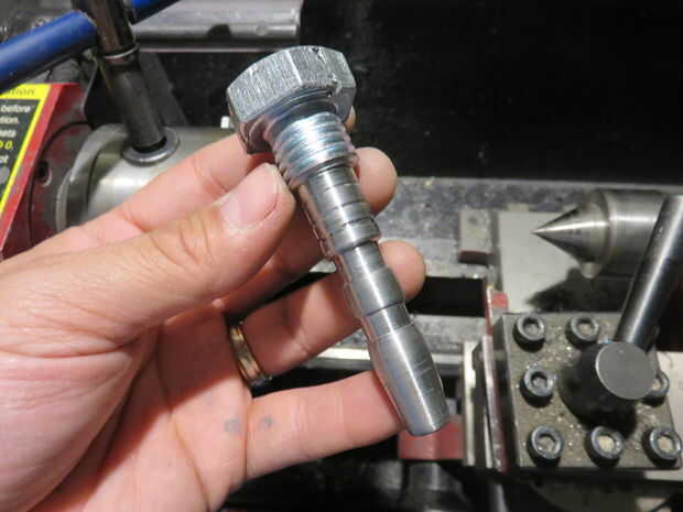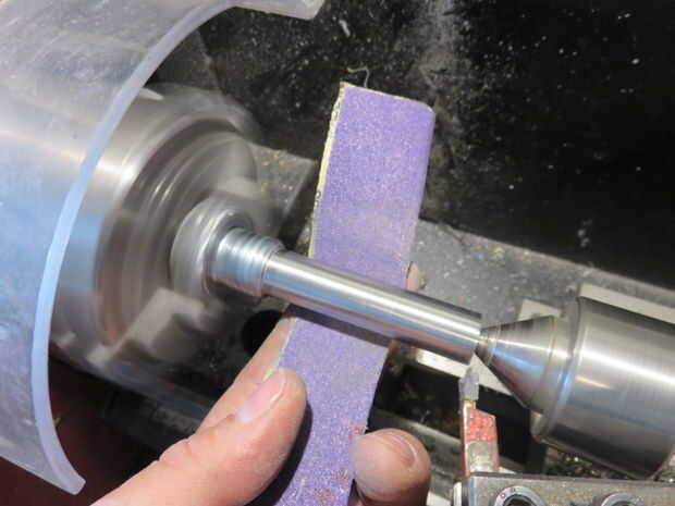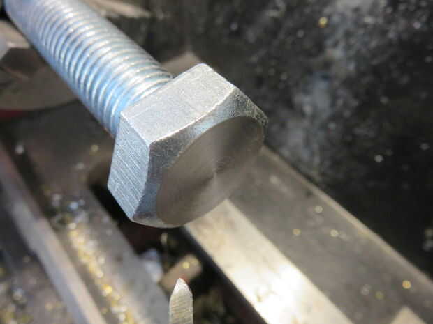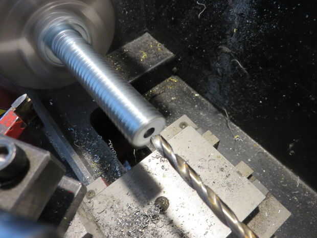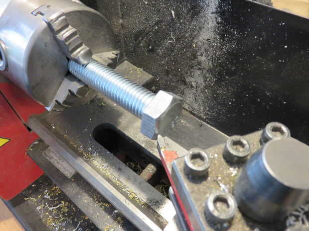 Todo el trabajo se realiza en un puerto de carga Mini torno. Para empezar yo a máquina una cara plana en la cabeza del perno. Esto ha permitido sentar Plaza contra el mandril cuando gira alrededor. Luego perforé un agujero en el extremo por lo que tendría un lugar para el centro vivo (un centro vivo es un soporte que gira junto con la pieza de trabajo y apoyo).