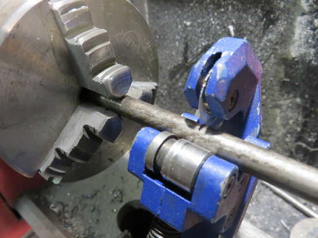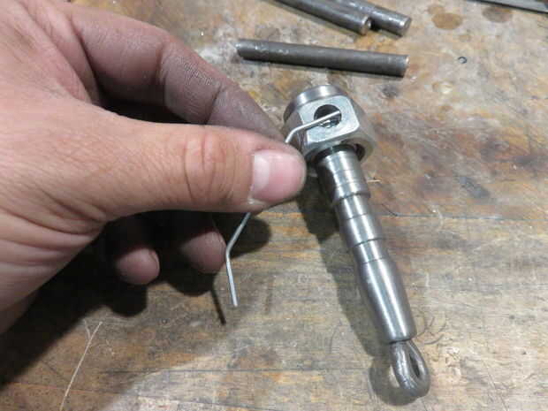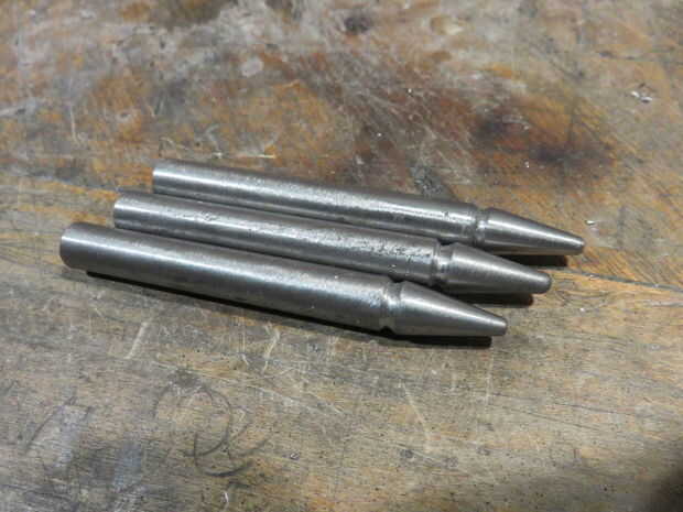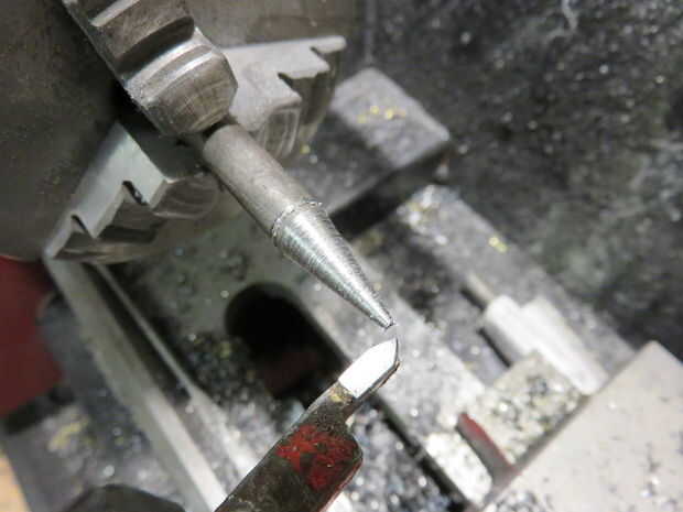 Esto no es la forma sancionado por usar un cortatubos pero lo hago todo el tiempo y funciona muy bien. Cortar 3 tramos de igual longitud de la varilla de 5/16". Puse mi torno a 10 grados y trabajado a máquina a un punto en cada diente. A continuación utilicé un trozo de alambre para ayudar a determinar la forma final.