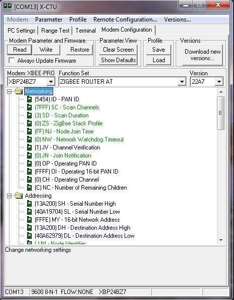Siguiente haga clic en la ficha de configuración de módem configurar el módem y la versión a los valores que aparecen en el cuadro de diálogo. Las siguientes instrucciones son los más importantes. Establecer uno de lo XBee al Coordinador en modo y otro XBee al router en modo en la función. Luego clic en PAN ID y dar mismo valores para ambos el XBees. En el IDE del router configurar la verificación de canal a 1. El alto número de serie del router debe ser