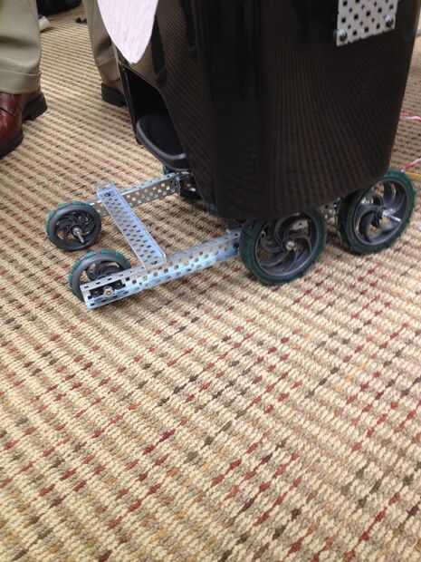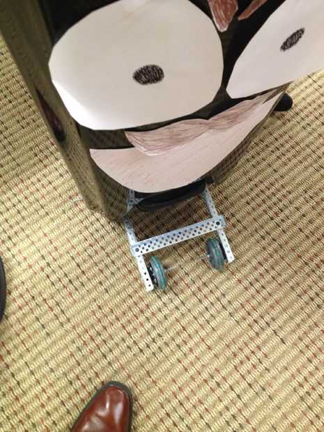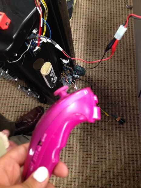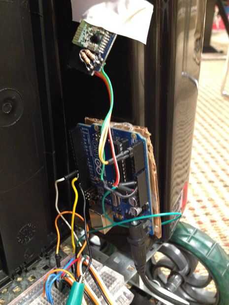Como se ve en la foto, ayudado a convertir la papelera en un cable loco doble Arduino puede que comprime la basura, se mueve alrededor y muestra cómo todo es.