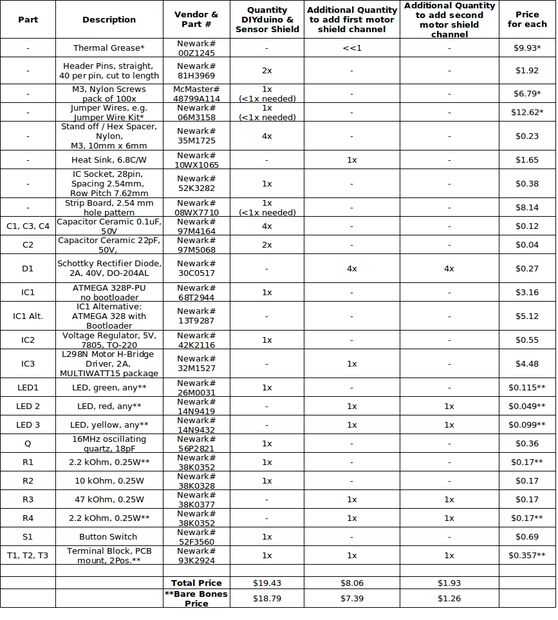 No considero los precios marcados con el asterisco solo por el precio total del aparato. Otra nota que precios de artículos en Newark cuando usted pide un cierto número de piezas, por lo general si pides más de 10 x. Me aparece los precios individuales más altos y también omite cualquier ofertas o promociones especiales. Si usted compra más el precio bajará. Por otra parte, no todas las Partes enumeradas aquí son realmente necesarios para la operación. Las partes que se pueden omitir están marcadas con un asterisco doble. El 'precio de huesos desnudo' también está indicado en la parte inferior de la tabla.