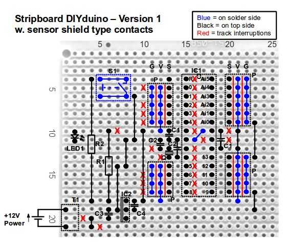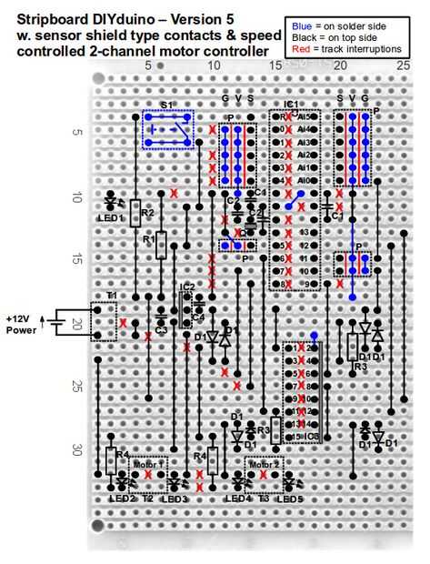 5. el sensor escudo tipo conector filas son GND / + 5V/señal (GVS) a la izquierda y la señal / + 5V/GND (SVG) en el lado derecho con respecto al ATMEGA. Esto significa que la fila de señal es siempre cierra el ATMEGA y la fila de tierra más lejana.