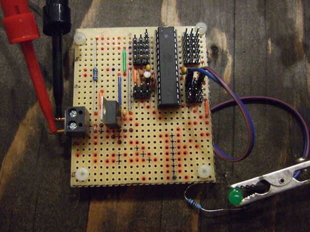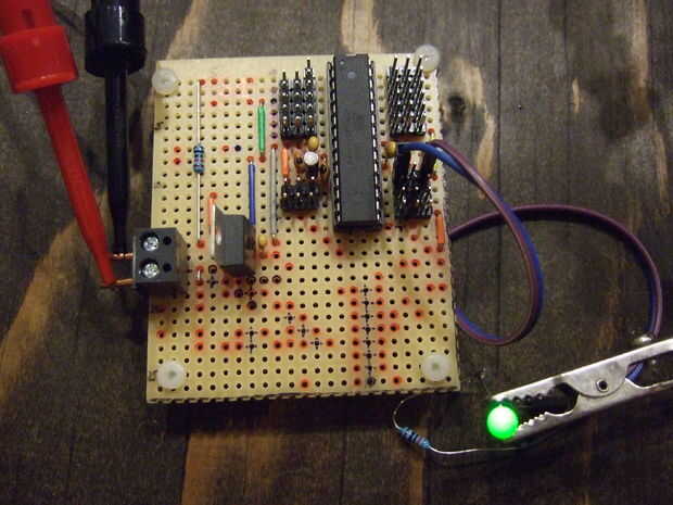 La Junta que construyó era una versión de "Bare Bones", por lo que no lugar LED1 y R1 en el tablero. Si lo haces, LED1 deberá encenderse cuando alcanza 5V la salida de IC2 o incluso antes. Por favor, asegúrese de que R1 es seleccionado adecuadamente para el LED1 y un voltaje de 5V. Se puede utilizar para determinar cómo hacerlo.