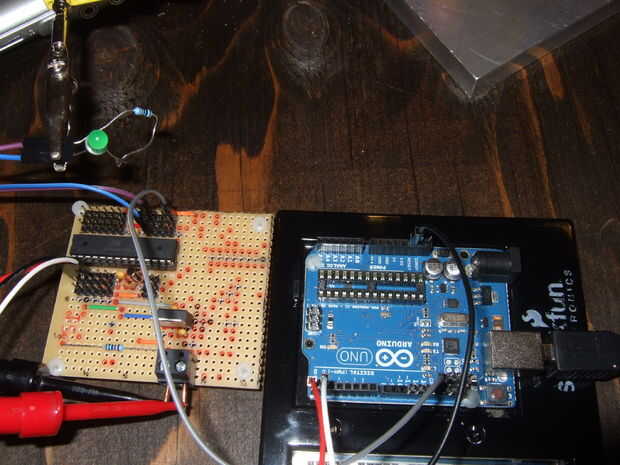Ya tenía un ATMEGA328 con "Bootloader" y "Blink" que usé para probar la funcionalidad del circuito DIYduino programado. Puedes mirar mi primer instructable para encontrar información de cómo cargar un bootloader y subir un dibujo sobre un ATMEGA328 en blanco. Para la prueba había conectado un LED en serie con una resistencia al pin13 del ATMEGA328 utilizando los contactos de tipo de sensor. El par de LED/resistor se calculó para 5V. El ánodo del LED (cara redonda) fue conectado a la señal Pin13, el cátodo (lado plano) fue conectado a la resistencia, cuyo otro lado fue conectada a tierra. Me aseguré de que la fuente de alimentación, que todavía estaba conectada desde el paso anterior, fue apagada. Luego le enchufamos el ATMEGA328 que contiene el bosquejo de Blink en el zócalo del IC y encender la fuente de alimentación. Efectivamente el LED comenzó a parpadear, que indica que mi DIYduino estaba en funcionamiento.