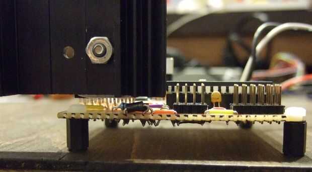 f) todos los diseños con los controladores de motor tienen al menos un diodo montado en posición vertical. Para el tablero de la versión 3 que se muestra en la figura el diodo vertical tenía un conflicto con el disipador de calor. Para que sea trabajo, doblado las puntas de este diodo establecer más. Esto creó un espacio suficiente para el disipador de calor.