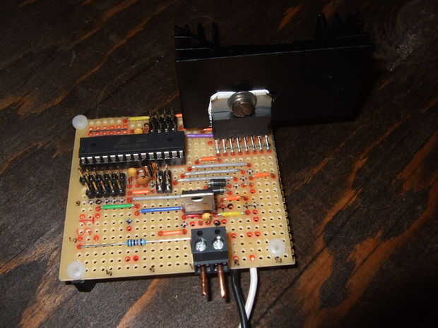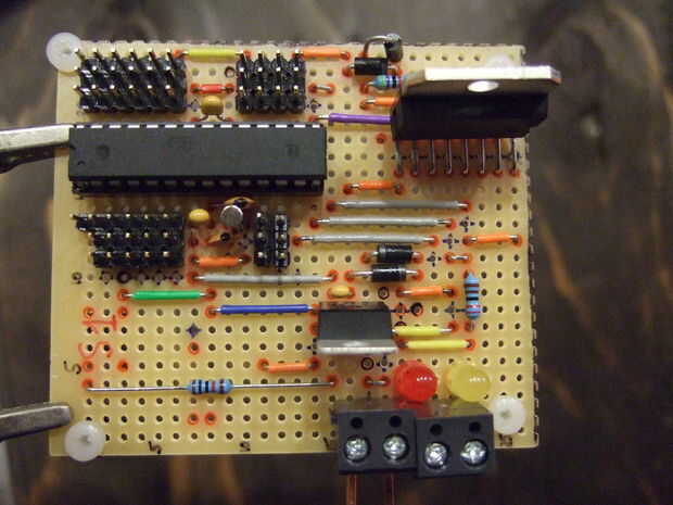 b) en la segunda imagen veis el mismo tablero montado para mi proyecto actual en una versión de desnudo huesos. Este Consejo renuncia a los conectores para los pines de entrada analógicos, 2 LEDs y 3 y el terminal de tornillo. En lugar de la terminal había soldado los cables para los motores directamente sobre la placa perforada.