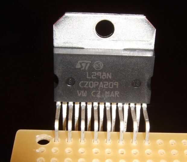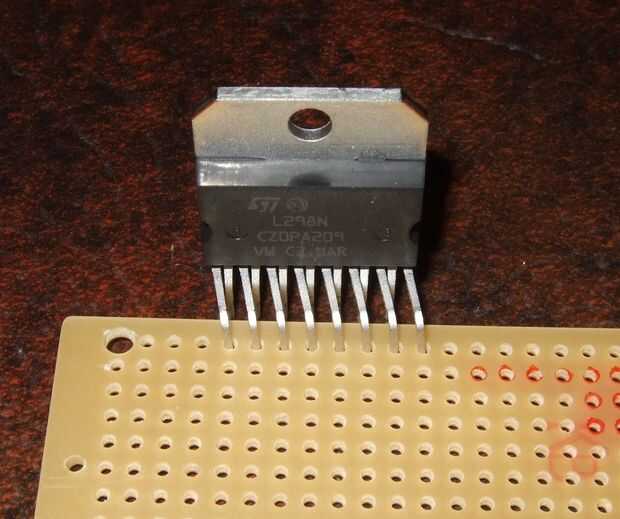 c) la L298N tiene un paquete Multiwatt15. No todos los conductores de 15 del paquete alinee con 0,1" patrón del agujero de la placa perforada. Para alinearlos, inserté los ocho contactos frontales del paquete en la fila de cierre de orificios situados al borde de una placa perforada como se muestra en uno de los cuadros, dejando los siete contactos traseros colgando sobre el borde. Entonces empujó suavemente hacia la izquierda hasta que las patas traseras con las patas delanteras como se muestra en la siguiente imagen. Además visualmente inspeccionadas y había confirmado con mi voltímetro que tenía no hay cortocircuitos entre contactos adyacentes.