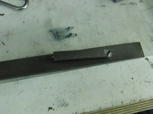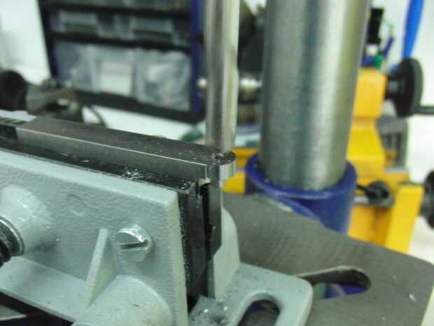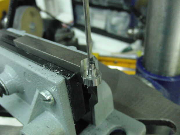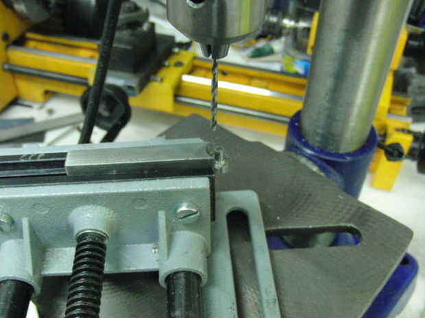 A continuación, la parte se sujeta en un tornillo de máquina y sino debajo del Banco para taladro 2.5mm agujero hasta el vástago de montaje. A continuación había aprovechado un hilo de M3 en el agujero con mi taladro de mano.