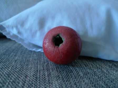 Usar un cuchillo puntiagudo y hacer un agujero en la bola de EVA. No hacerla demasiado grande como el EVA se extiende. Desea. El agujero debe ser de 1/2 el tamaño de la cabeza de bola. (en la foto es mi prototipo, poco ásperas en los bordes)