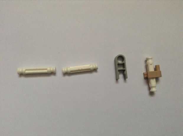5) atacar las 2 mitades juntos, usando las barras de blanco, el clip tan va en la esquina. Mantenga el conector gris para más adelante.