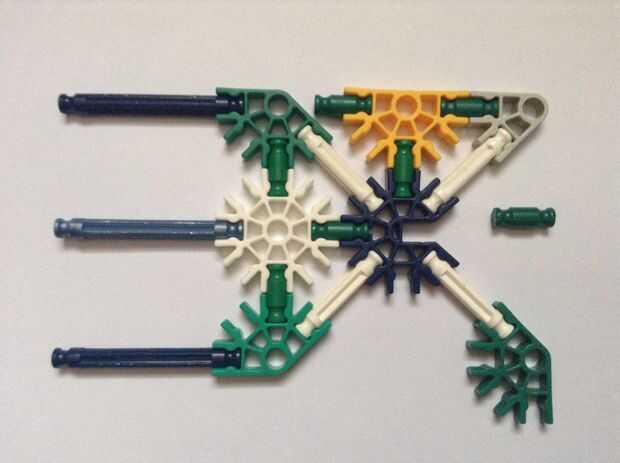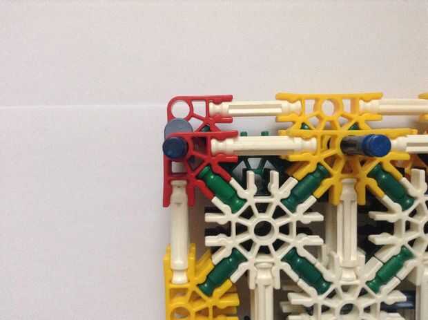 8) Deslice el bloque grande sobre las 3 varillas azules. Ahora podemos agregar el conector gris, entre los conectores rojo en la esquina.